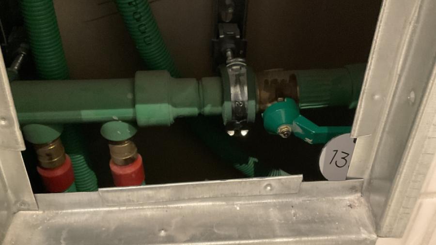 Ventilerna finns bakom en lucka i bad/duschrum, se bilder ovan. Luckan öppnas genom att dra utåt där det finns en fasning i luckan, man får ta i lite och eventuellt ta en skruvmejsel eller liknande till hjälp. Ventilerna finns bakom luckan och ibland är de inte direkt synliga utan man får treva runt lite. Två ventiler, en för kallvattnet och en för varmvattnet, finns. Stäng av och sätt på kall respektive varm-vattnet upprepade gånger till det går relativt lätt att vrida.